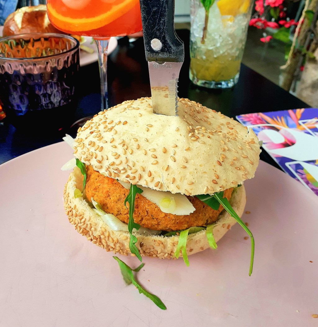 Samen met mijn vriendinnen beslis ik om nog een keertje in Hasselt te gaan eten. Na een kleine zoektocht kom ik uit bij Botanique, een hip restaurant op de Zuivelmarkt. Ik kijk online naar de menukaart (https://uploads.strikinglycdn.com/files/93e16e2a-8771-462b-baa3-c7a0ebae1b0a/menuapr24.pdf) en ik zie al veel glutenvrije opties staan. Daarnaast zijn er ook vegan opties, iets dat ik liever heb dan een stukje vlees. Mijn vriendin Julie pik ik op in Lummen op de carpool parking en we rijden door tot in Hasselt. Ik parkeer de auto op het Kolonel Dusartplein. Vandaag mogen we gratis parkeren aangezien het een feestdag is. Van het Dusartplein is het 5 minuten stappen naar de Zuivelmarkt. Het is avond en gezellig druk in Hasselt, de terrasjes zitten vol. Ik ben blij dat we gereserveerd hebben zodat we zelf ook een plekje op het terras kunnen veroveren. Mijn andere vriendin Kim is al ter plaatse en wuift ons tegemoet. Het terras van Botanique is heel gezellig aangekleed, het heeft iets boho achtigs en je waant je direct in een zomerse sfeer. Met ons drieën bestellen we elk een cocktail en kijken rond op de menukaart. Kim en ik gaan voor de Pumpking, de pompoen-zoeteaardappelburger. Voor mij met een glutenvrij broodje. Julie bestelt het Epic Kapsalon, hiervoor is er geen glutenvrije optie. De man die onze bestellingen opneemt en serveert blijkt ook de eigenaar van de zaak. Een zeer vriendelijk en aangenaam persoon. Wanneer hij onze bestelling brengt en we de eerste happen van ons broodje nemen zijn we aangenaam verrast, wat lekker! Ook het glutenvrij broodje is smakelijk en helemaal niet droog. Na de burger kan er voor mij nog wel een dessertje bij. Ik bestel de Coco Jamboo, smeuïg kokossorbetijs met mango en ananas. Zowel de burger als het dessertje zijn helemaal niet zwaar en ik heb na het eten geen opgeblazen gevoel (iets dat wel al eens voorkomt, zeker als het eten vettig is). Wanneer we bijna klaar zijn met eten komt de eigenaar nog een praatje met ons maken. We hebben het vooral over honden en ik complimenteer hem voor zijn mooie zaak met het lekkere eten. Dit is oprecht, want wij hadden hier een hele fijne ervaring. Wanneer ik voor ons vertrek naar toilet ga kom ik terecht in een kleine discoruimte. Wat een hippe wc is dit! Het doet me lachen. Ik vind het een unieke ervaring, hier bij Botanique. Dus als je glutenvrij wilt lunchen of dineren in Hasselt, kan ik deze plek zeker aanraden.