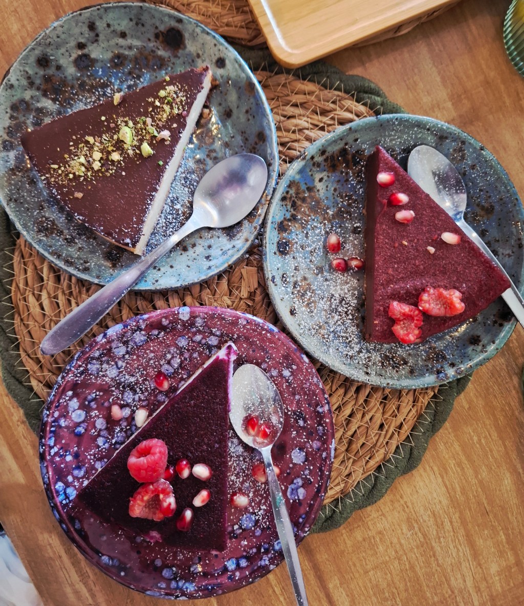 Als afsluiter konden we kiezen uit drie soorten glutenvrije cheesecake: chocolade/pindakaas, vanille/framboos en chocolade/framboos. We proefden ze alle drie, en hoewel ze allemaal heerlijk waren, sprong de chocolade/pindakaas variant er voor ons uit (omdat het verdacht veel naar Snickers smaakte). Een echte aanrader, die bij de kinderen meteen in de smaak viel.